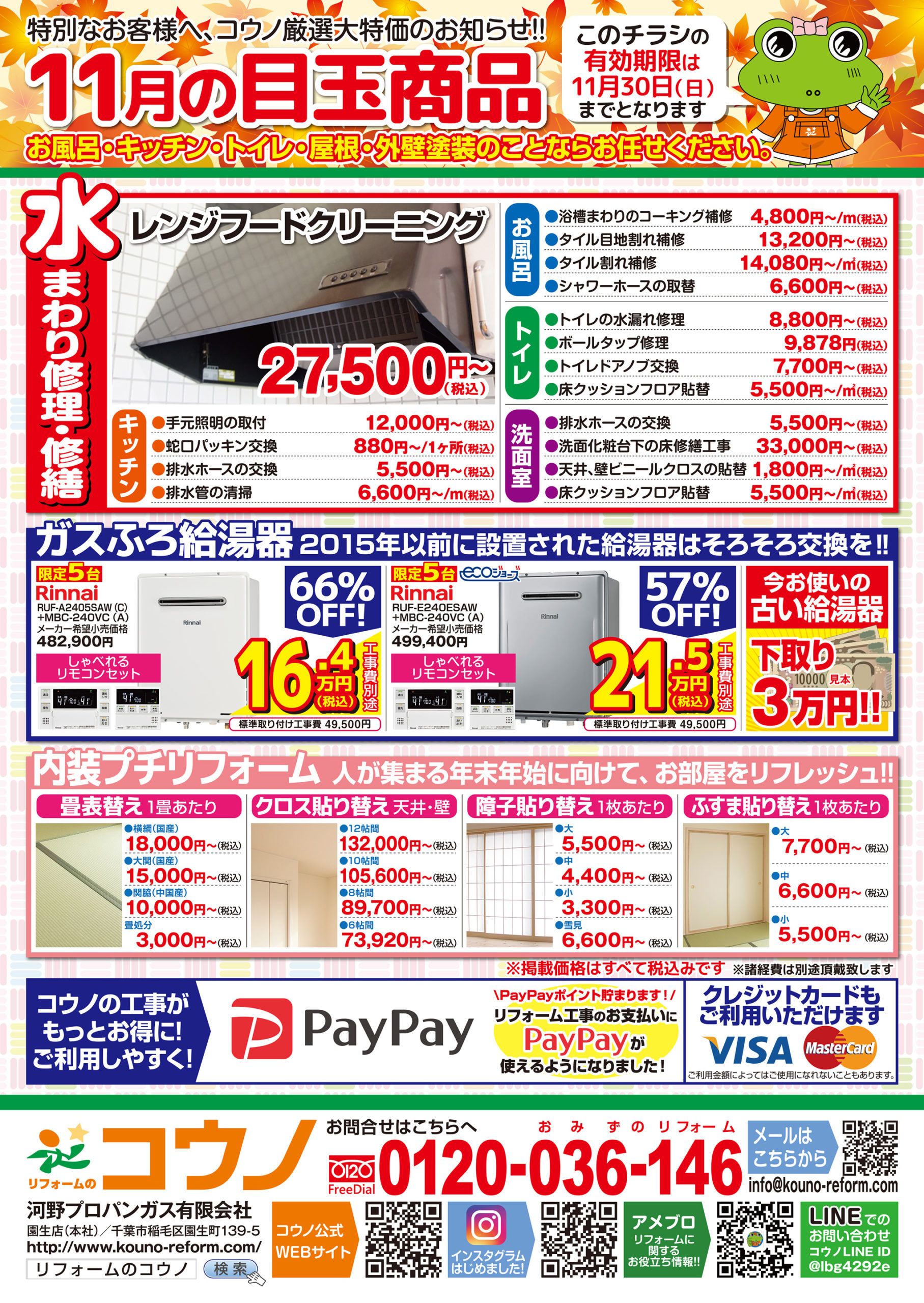 2025.11.01 11月の目玉チラシをアップ! 11月の目玉チラシをアップしました! 年末年始を安心して迎えるためにも、水まわりのご心配事は今のうちにケアを!また12月はクリーニングのご依頼は大変混み合いますので、ご相談はお早めに! 真冬にお湯が出なくなったら大変!設置から10年以上経過した給湯器は早めの交換をご検討ください! ガスふろ給湯器プランはこちら 人が集まる年末年始に向けて、綺麗なお部屋でお迎えしたい方に!! 内装プチリフォームはこちら