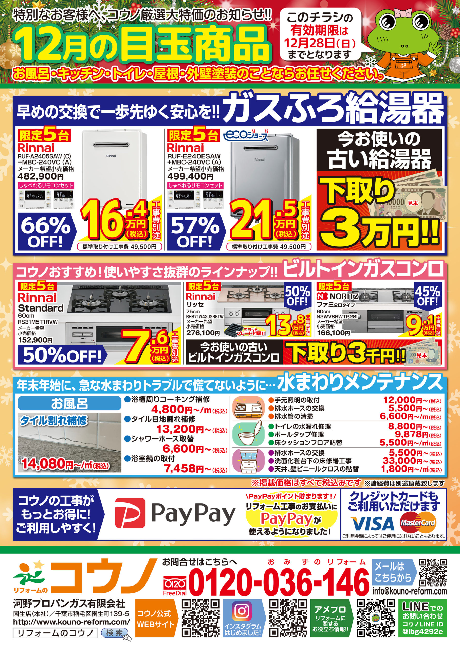 2025.12.01 12月の目玉チラシをアップ! 12月の目玉チラシをアップしました! 年末年始にお湯が使えなくなってしまったら大変!安心して新年を迎えるためにも、早めの交換・修理で一歩先ゆく安心を。ご相談はお早めに! ガスふろ給湯器プランはこちら 設置から10年以上経過した給湯器は早めの交換をご検討ください!またお急ぎの場合はスマホで簡単に風呂給湯器のお見積もりが可能です。